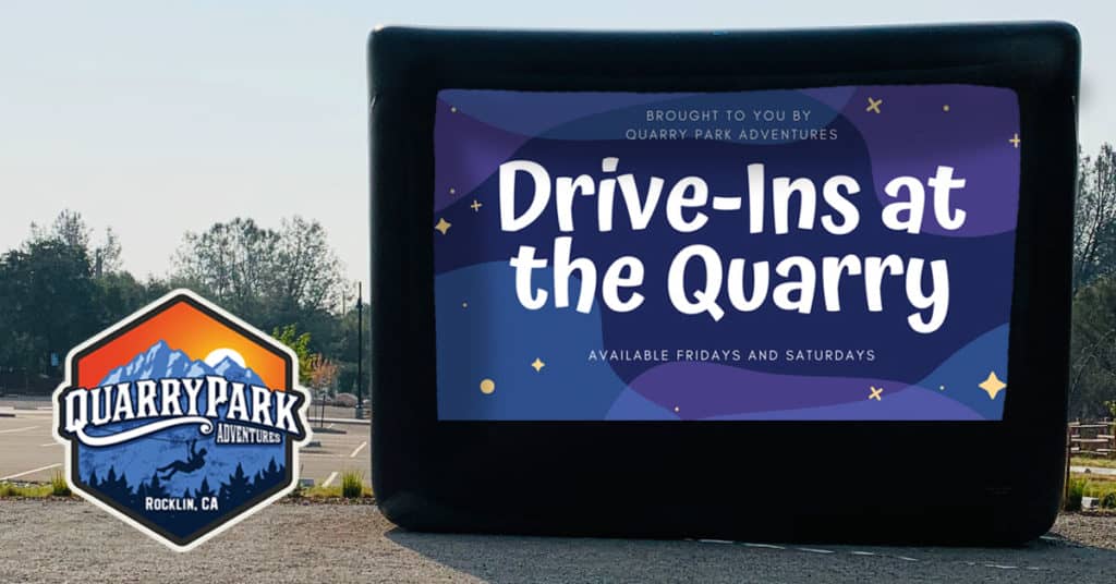 Join us at Quarry Park Adventures in Rocklin for our new entertainment series: Drive-Ins at the Quarry! BOOK NOW WHEN: Friday & Saturday nights, running through the Fall. Start time depends on sunset schedule. See each movie listing below for details: Lot opens one hour prior to movie … [Read more...] about Drive-In Movies at the Quarry