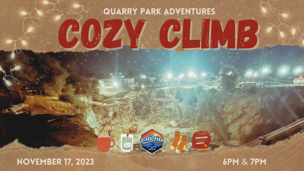 This special event offers a unique, after-dark opportunity to climb in the Quarry with cozy lighting throughout. Layers and festive sweaters are highly encouraged for this event, where you’ll zip, climb, and soar through the night!